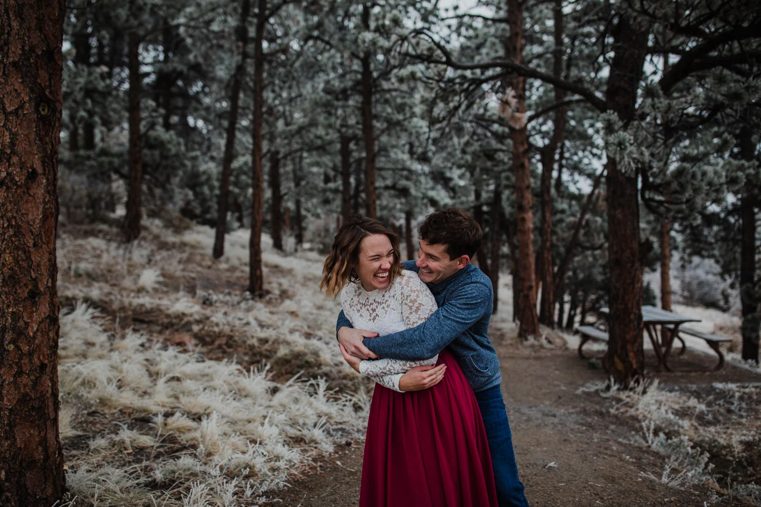This session will go down in history as one of my favorites of ALL TIME. Spending a winter (in the middle of fall!) afternoon with Karis and Johnathon at their couples photography session at Mount Falcon in Indian Hills, Colorado, was nothing short of a fairytale sort of day.